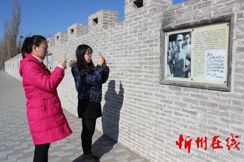 1月6日,山西农业大学就读的原平学子朱丽娟,利用在市新闻办学习的机会,与学姐常璐来到该市崞阳镇文化墙观看续范亭将军生平和毛泽东题词的老照片。为了缅怀历史,记住乡愁,崞阳镇搜集了40余幅抗日战争,解放战争时期的老照片,镶嵌在文化墙上,供人们参观。(曹申义 摄)