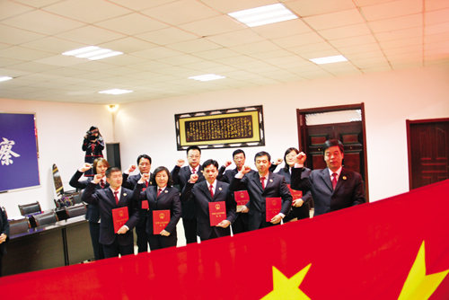 2 月25 日,岢岚县检察院举办首批入额检察官宣誓仪式。该院是忻州市检察系统2015 年司法体制改革首批试点单位。一年以来,经过层层选拔,首批10 名检察官脱颖而出,市检察院和岢岚县人大、政协领导到场祝贺,希望入额检察官担当重任,充分发挥职能作用,维护好社会公平正义。(程玉光 摄)