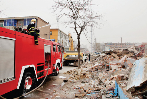 3月3日,忻府区城南片区拆迁工作全面展开,为避免城建拆除工作给周边居民带来的污染,忻府区领导迅速行动,安排部署区公安消防大队消防车在拆迁现场及时进行降尘洒水作业。图为降尘洒水现场。(侯睿 摄)