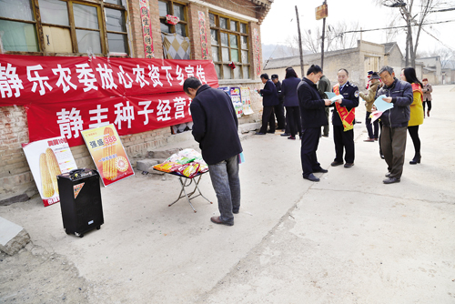 3月15日, 静乐县农委工作人员深入该县五家庄村、 木瓜山村、 沟口村开展 “放心农资下乡进村” 宣传活动。此次活动共向群众发放 《购种提示》 、 《欢迎使用12316农资打假投诉举报电话》 、 《高毒和禁用农药清单》 、 《种子法》 摘要等宣传资料3000余份。(闫晓梅 摄)