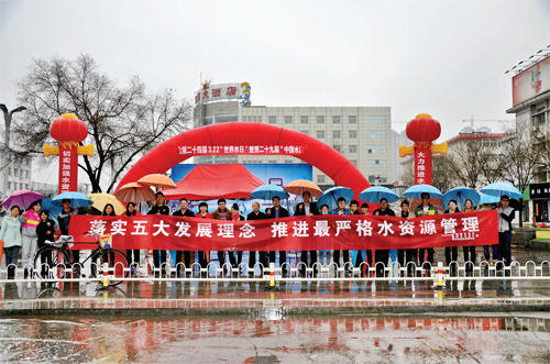 3月22日是第24届“世界水日”,也是第29届“中国水周”,市水利局、水资办、绿色地球协会冒着沥沥小雨联合在城区日月广场举行纪念活动。(马月林 摄)