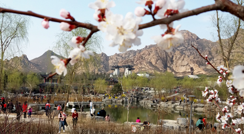 4月4日,游客在原平市天牙山风景区踏青游园。清明小长假,该市各公园正值早春花卉盛花期,游客在此赏花观景,感受春的气息。(褚震 摄)
