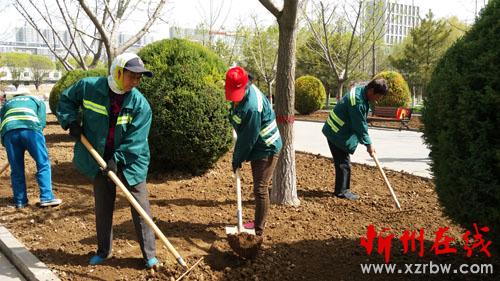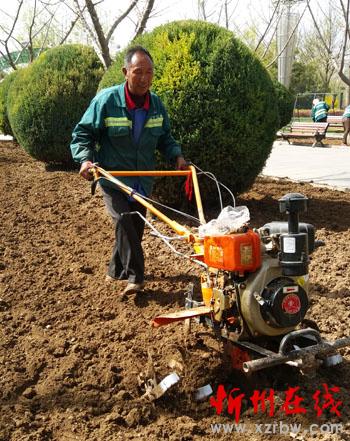 春暖花开,4月13日,忻州市人民公园的园林养护人员忙着翻地、施肥,为不同花期的育苗做准备。忻州市人民公园是我市城市文明的一大场所,为全方位提升人均环境质量和城市竞争力,给广大市民创造一个文明、卫生、安全、和谐的休闲游乐环境,园林养护人员一年四季不断地为公园绿化服务,确保公园内的花、草、树都能如期开花、结果。(李涛 摄)