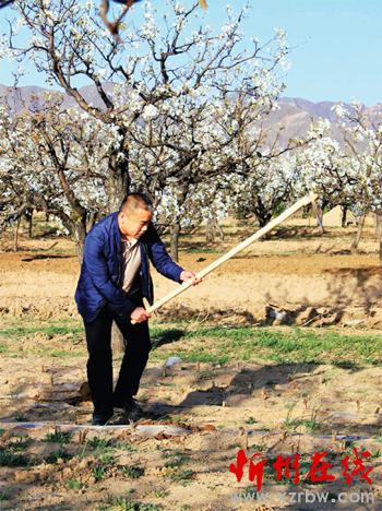 4 月16 日,游人在原平市万亩梨园中欣赏梨花绽放美景的同时,从农民手中“抢”过镢头,帮助农民刨地松土,体验劳作辛苦,分享劳动之美。城乡一体化建设,新农村景观吸引了城市市民,节假日、周末城里人纷纷走出“水泥森林”,深入到农村,不仅享受春光踏青赏花的乐趣,而且在乡村游中,与广大农民一起劳动,同吃同住,体会农耕文化之韵。(吉建平 摄)