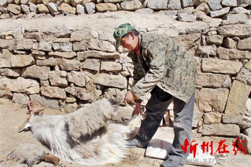 岢岚县西豹峪乡谢家坪村农民王占财,通过十多年努力,成为当地远近闻名的养羊大户。目前,他共饲养了240 余只晋岚绒山羊,在每年三、四月份的抓绒期,便可收入20000余元。图为他在抓绒。(李俊武 摄)