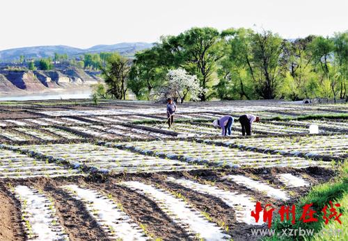 谷雨前后,点瓜种豆。4 月24 日,河曲县文笔镇唐家会村一户村民正在刚出苗的玉米地里套种豆角。该村充分利用紧邻黄河、灌溉便利的有利条件,通过实行地膜全覆盖和套种等方式最大限度地提高土地收益。这一带种植的玉米、豆角、大蒜等多种瓜菜类经济作物,尤其大蒜在周边很有名气,成为城区及周边瓜菜等农产品的重要供应地之一。(邬耿杰 摄)
