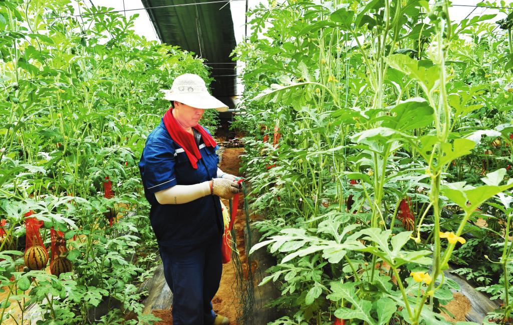 河曲县榆岭窊村坚持“内培外引”的育才模式,强化乡村振兴人才支撑,加强与山西农业大学合作,依托农业高校先进的种植技术,发展现代新型农业,常态化开展农业实用技术培训,培育新型职业农民,带领村民增收致富。图为榆岭窊村西瓜大棚内村民在缠蔓整枝。(记者 冯晓磊摄)