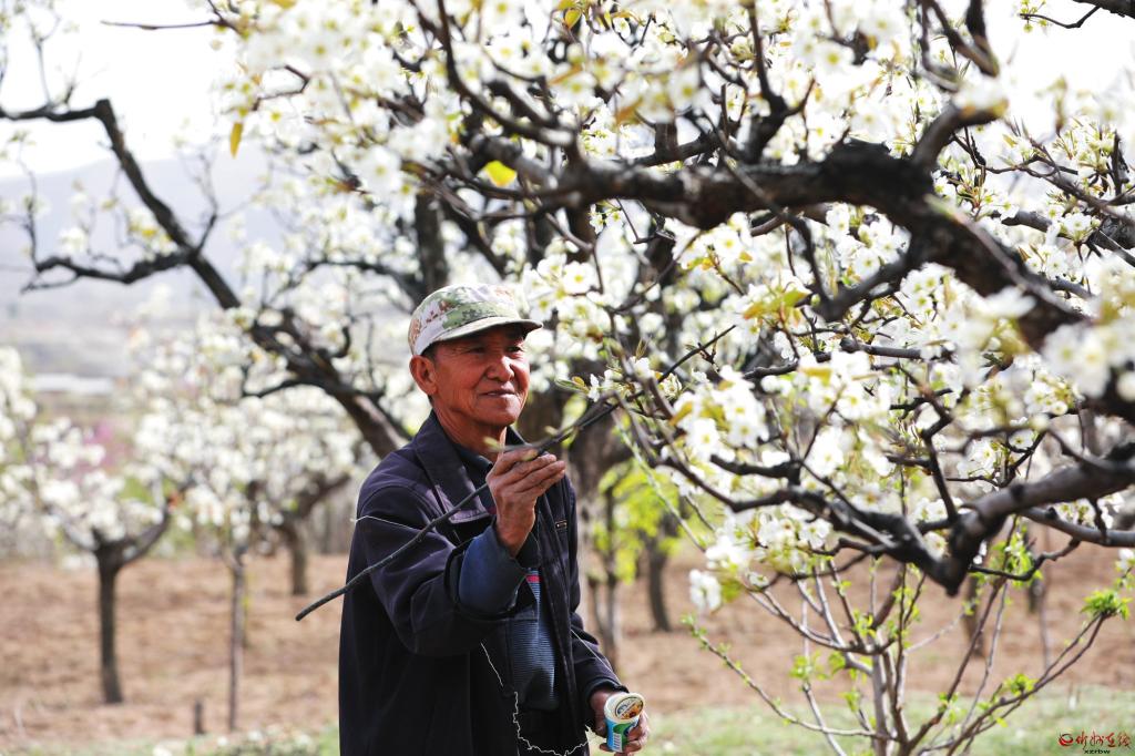 4月16日,原平市同川镇上庄村村民正在梨树林为梨花授粉。近日,同川镇万亩梨树进入盛花期,当地果农抓住春季梨树管护的最佳时节,加紧给梨花进行人工授粉,为提高果树产量打好基础。(褚 震 摄)