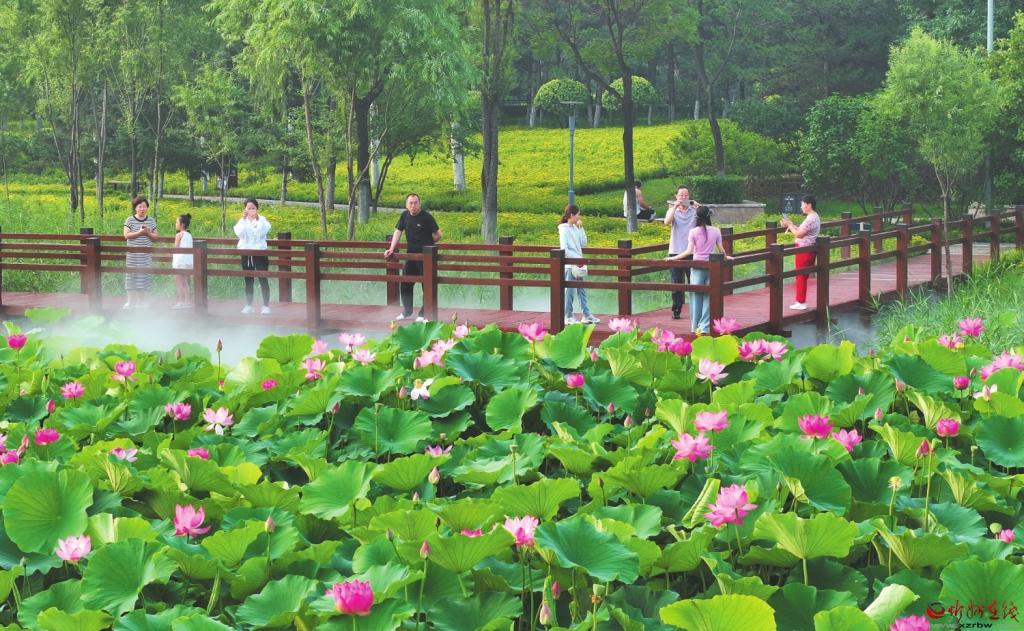 近日,云中河景区的荷花竞相绽放,吸引众多游客前往赏荷花、闻荷香。(