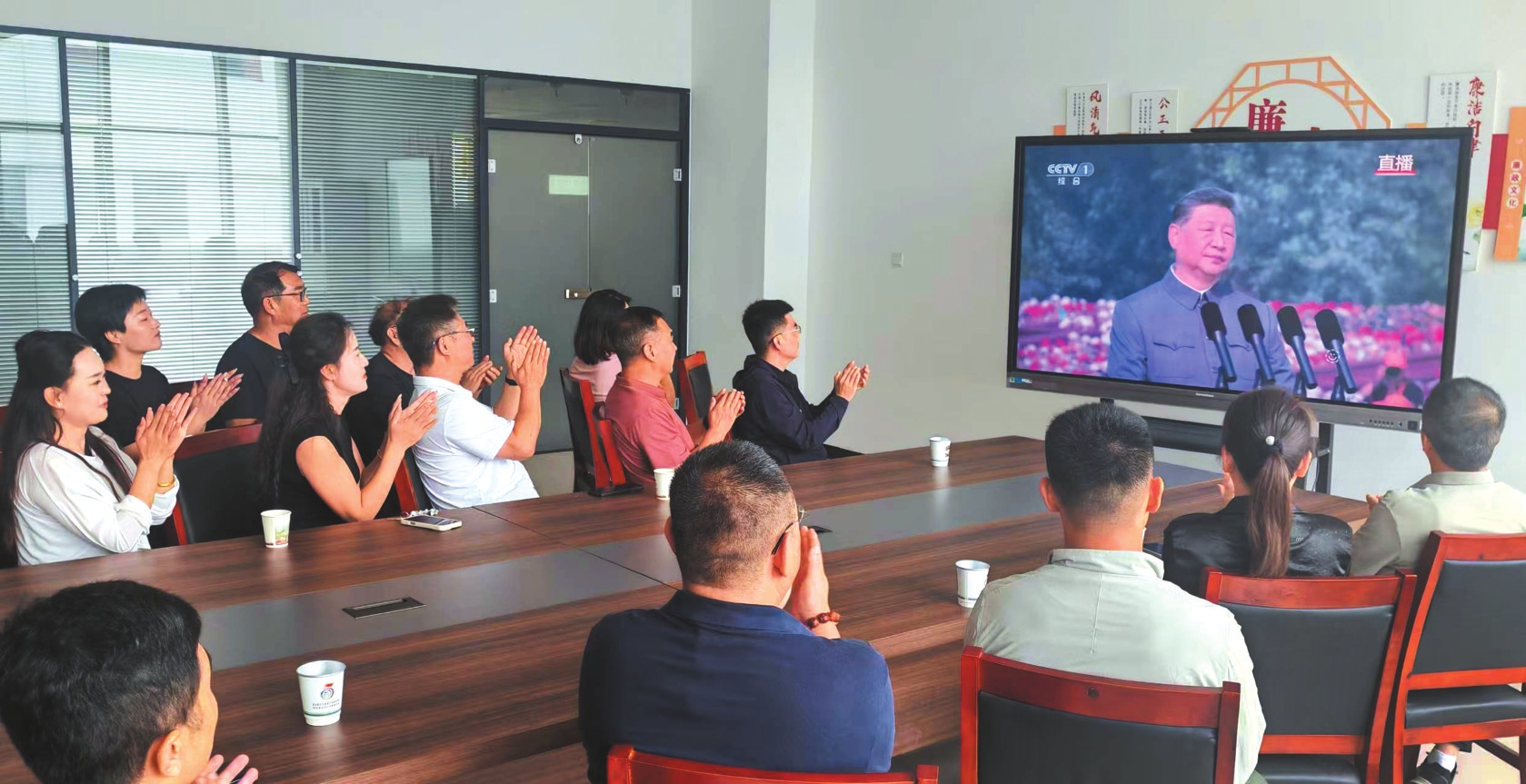 山西金正达金属制品有限公司员工观看纪念大会。刘婧摄