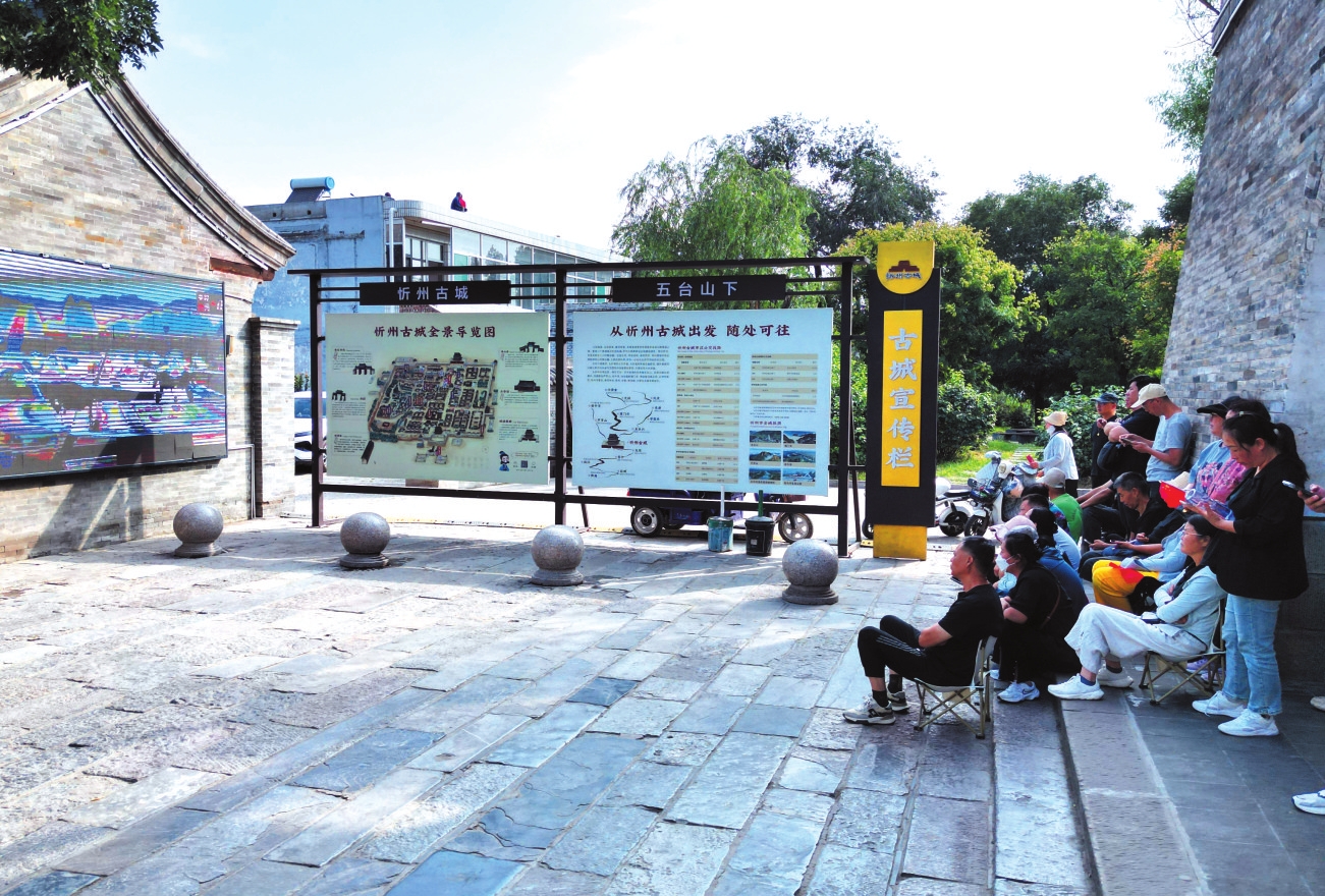 五台山景区游客服务中心大厅,游客正在观看纪念大会。张睿容摄