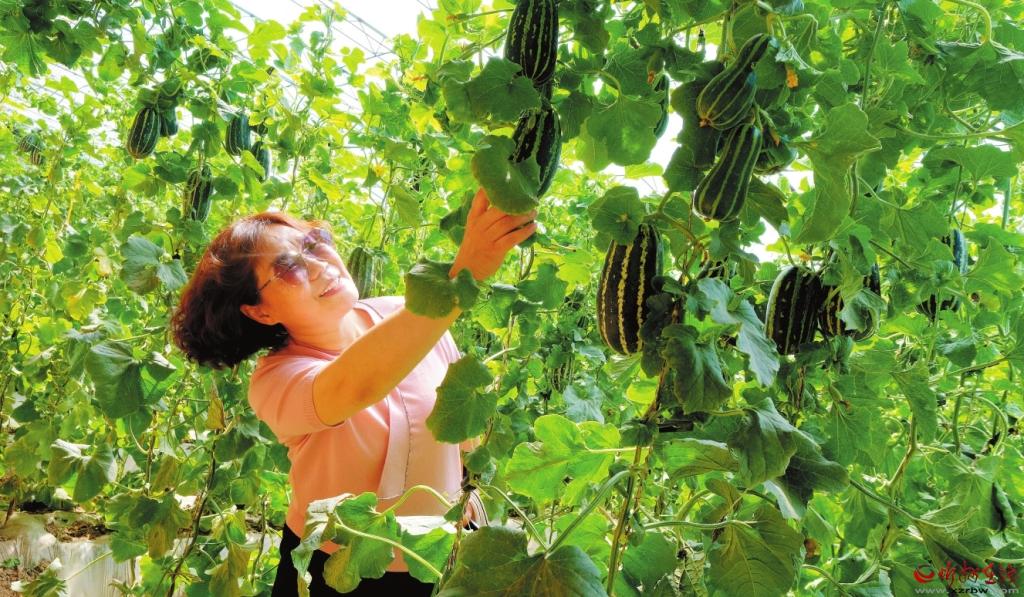 定襄县大南庄村香瓜种植专业户利用南瓜根系嫁接香瓜新技术,实现了稳产增产,亩均收益5万元以上。图为游客在采摘香瓜。(