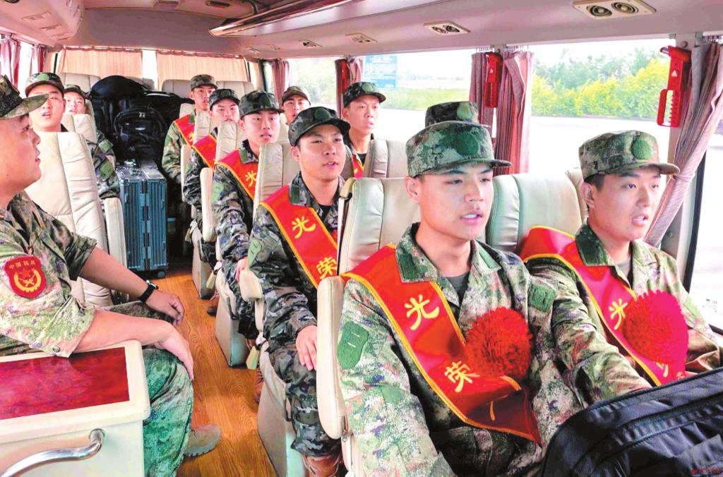 近日,定襄县开展新兵入伍送兵活动。中巴车内,身着迷彩服的新兵们佩戴“光荣”绶带与大红花,精神抖擞、目光坚定。这辆承载着殷切期望的专车,将正式送他们踏上从军报国的新征程。(郭婧蕾摄)