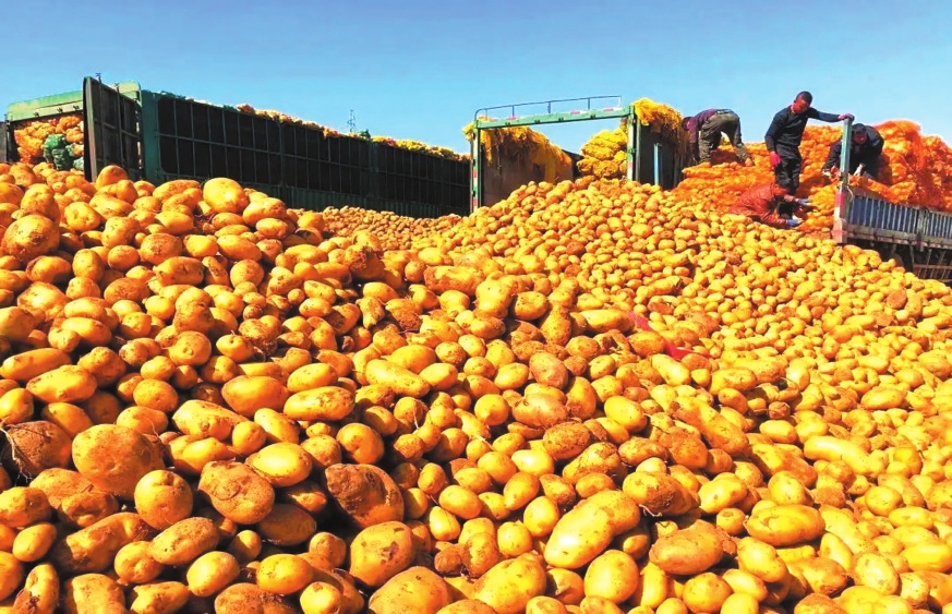 大田作物中,玉米贡献了秋收“主色调”:玉米田穗大粒满,金黄果穗缀满秸秆,机械化收割设备穿梭田间。高粱与谷子在丘陵山区长势喜人,红透的高粱穗与沉甸甸的谷穗随风摇曳。土豆则以“地下黄金”之姿获得丰产,圆整块茎从土壤中翻出,分拣后装车外运。