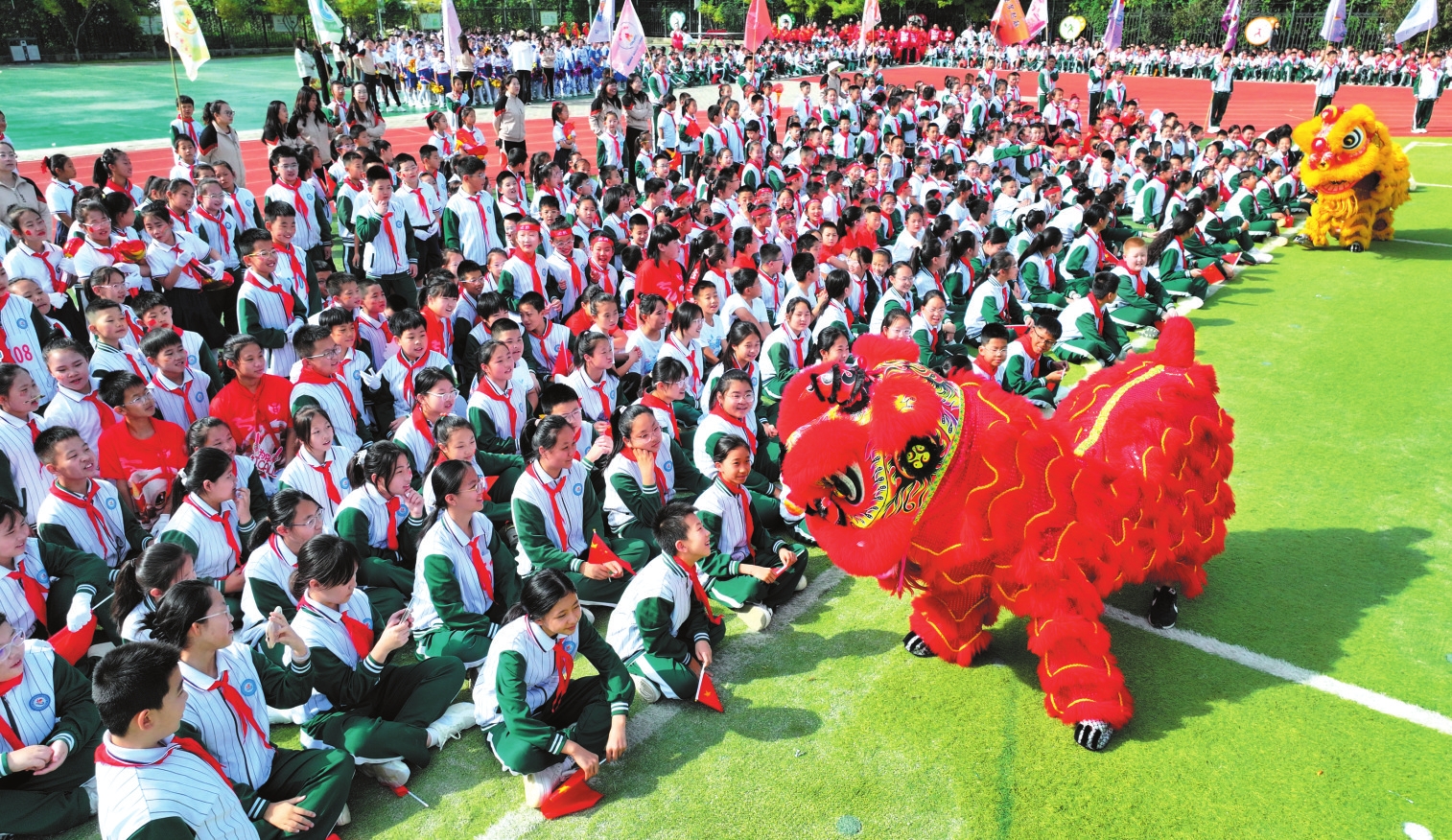 9月28日,忻州市长征小学西校区举行第二届秋季田径运动会。图为开幕式上孩子们与“狮”互动。(