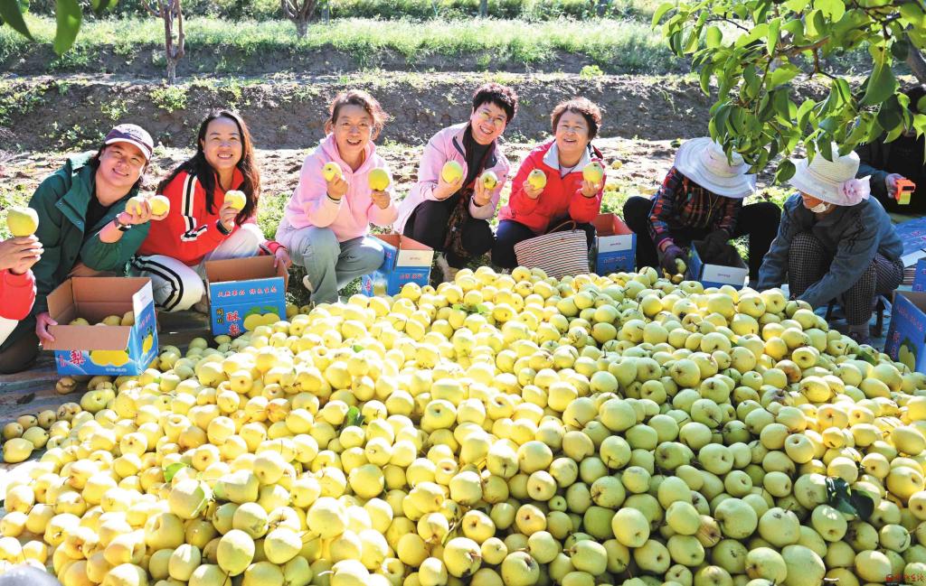 定襄县北社东村、北社西村一带盛产酥梨。由于交通便利,金秋十月吸引了众多观光客前来采摘。田间地头,梨树之下,一派丰收景象。(