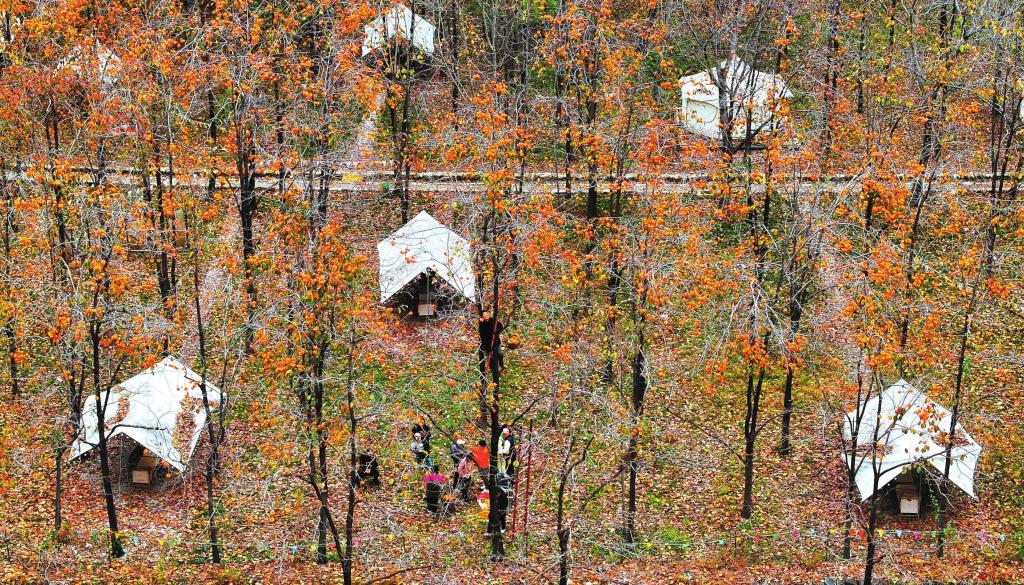 树上生产力,树下购买力。霜降时节,位于定襄县东峪自然保护区戎家庄的露营基地柿林内,村民忙着在树上摘柿子,游客等着在树下买柿子,给这个美丽的秋天,编织出一幅祥和的图景。(张晋兰 摄)