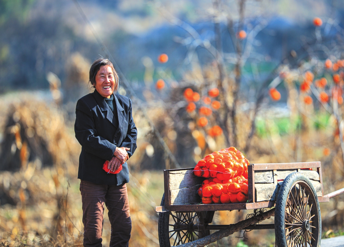 地头那畔,景象便不同了。一对年轻的夫妇,正手脚利落地采摘、分拣柿子。竹篮里,橙红的果实渐渐堆成小山。他们时而低语,声音轻得像风拂过枝梢,说的或许是今年柿子的成色,盘算着能卖个好价钱;或许是在憧憬,等这笔钱到手,该给娃添置些什么。他们额上有细密的汗珠,眉宇间有劳作后的倦色,但那份倦色底下,却藏不住一股子蓬勃向上的劲儿,一种属于明天的、清亮亮的盼头。