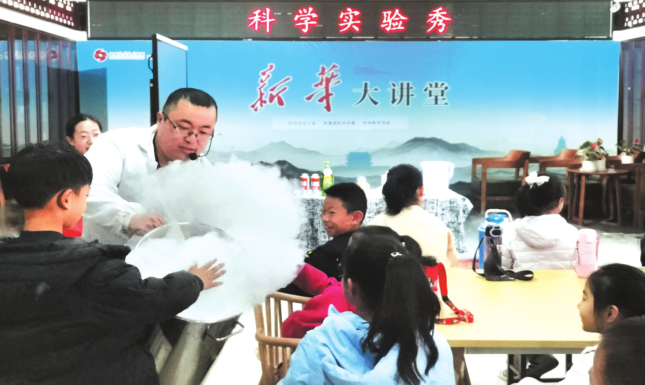 近日,在市图书大厦“腾云驾雾”科学实验秀上,小朋友兴奋地触摸了“白云”。由市总工会、共青团忻州市委主办,忻州新华书店协办,每周一次的“新华大讲堂”深受小朋友欢迎。(本报记者宫清华摄)