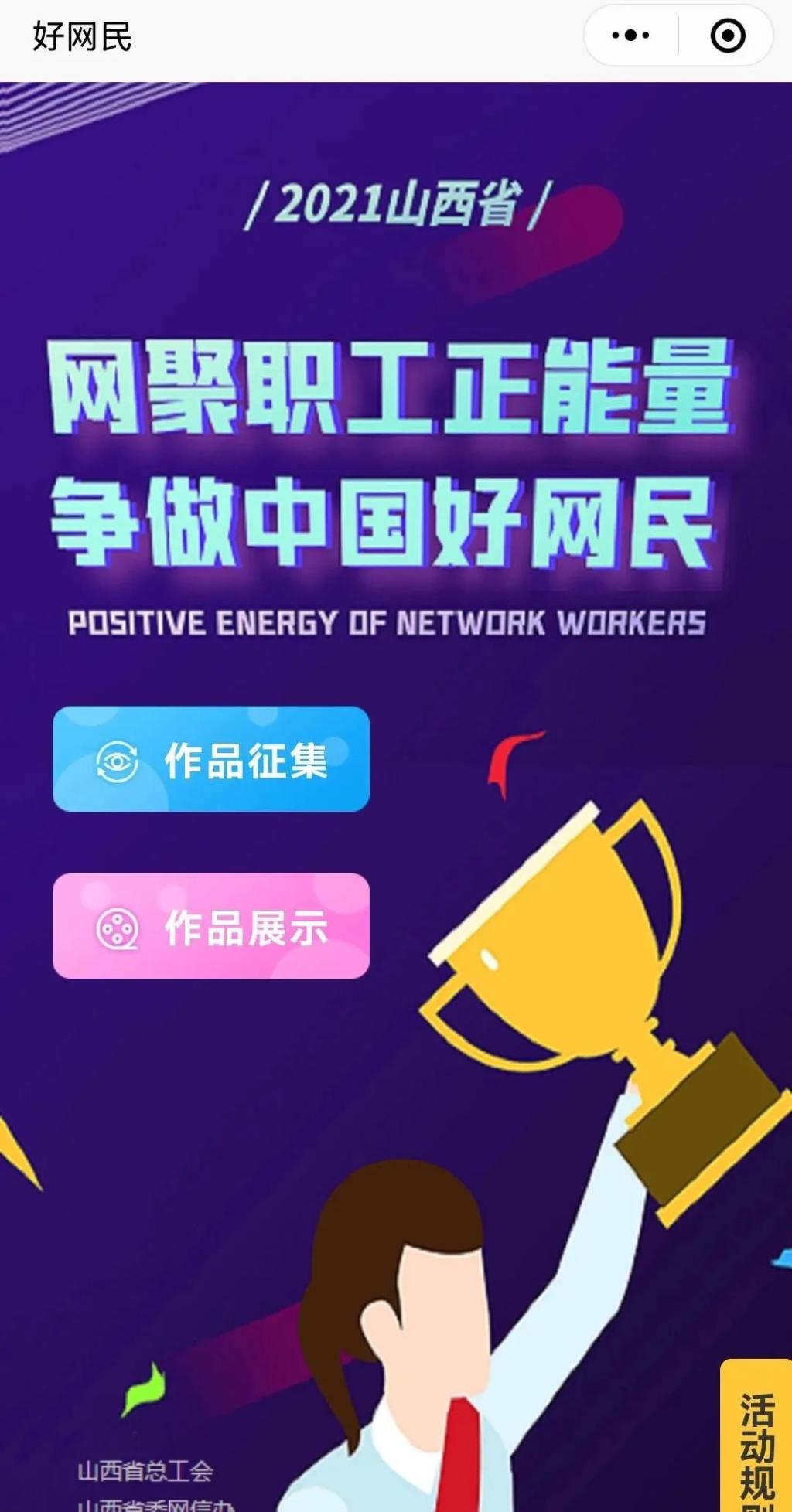 经过前期的筹备和运行测试,2021年山西省“网聚职工正能量 争做中国好网民”主题活动小程序今日正式上线,同时进入征集和投票点赞阶段。