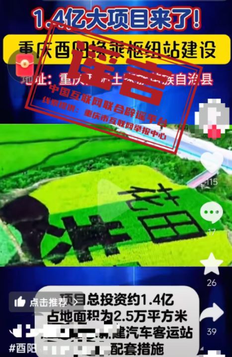 真相:近日,有网民发布信息称“1.4亿大项目来了,重庆酉阳换乘枢纽站建设,新建汽车客运站及相关配套”,引发关注。经重庆市酉阳县交通运输委核实,酉阳县正在推进桃花源景区游客集散中心提升项目,暂无“1.4亿建设换乘枢纽站”项目,网传信息系谣言。(来源:“重庆辟谣”微信公众号)
