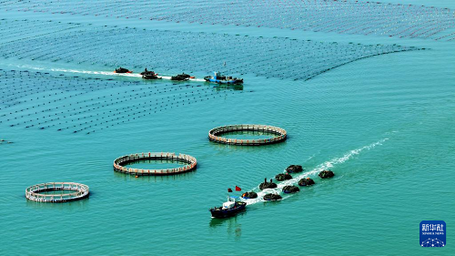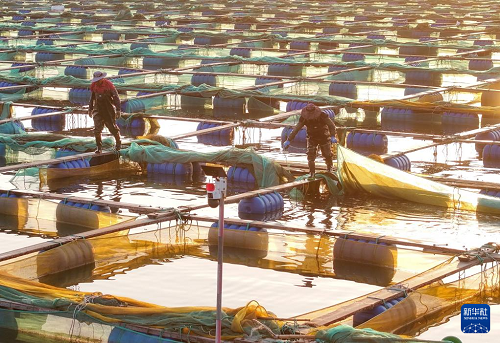 4月15日,在山东省荣成市石岛管理区桑沟湾海域网箱养殖区,渔民开展养殖作业(无人机照片)。(新华社发 李信君 摄)