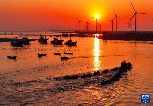 4月15日,在山东省荣成市石岛管理区桑沟湾海域,渔民驾船出海作业(无人机照片)。(新华社发 李信君 摄)