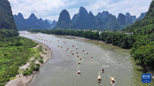 8月10日,在漓江广西桂林市阳朔县兴坪镇段,游客乘竹筏游玩赏景(无人机照片)。(新华社发 何红福 摄)