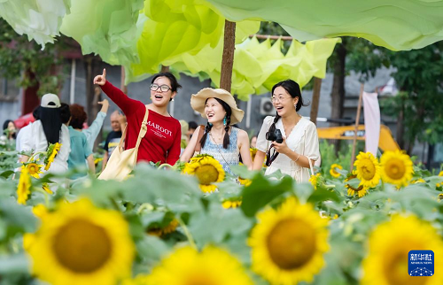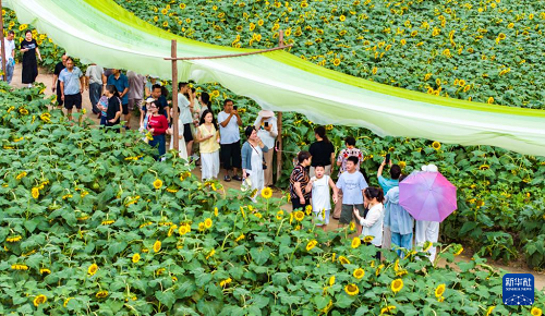 8月12日,游客在河南省驻马店市西平县老王坡产业融合发展示范区的百亩油葵花海游玩。(新华社发 赵永涛 摄)