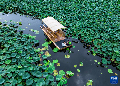 8月13日,游客在江苏省兴化市万亩荷塘景区赏荷游玩(无人机照片)。(新华社发 周社根 摄)