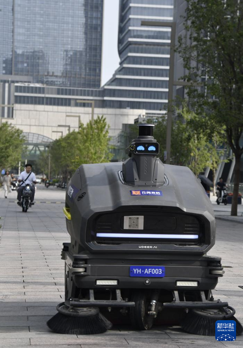 8月16日,一台机器人保洁员在通州区运河商务区清扫街道。(新华社记者 李欣 摄)