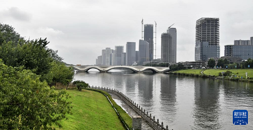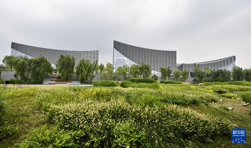8月15日拍摄的大运河沿岸的北京艺术中心。(新华社记者 李欣 摄)