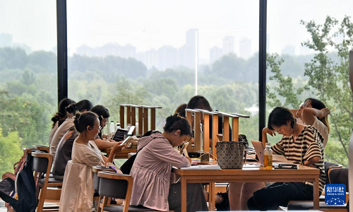 8月15日,市民在北京市通州区大运河沿岸的北京城市图书馆阅读。(新华社记者 李欣 摄)