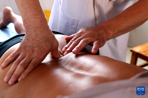 8月18日,在山东省临沂市平邑县温水镇卫生院,中医师为患者正骨推拿。(新华社发 武纪全 摄)