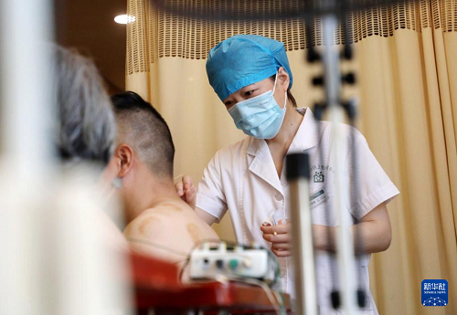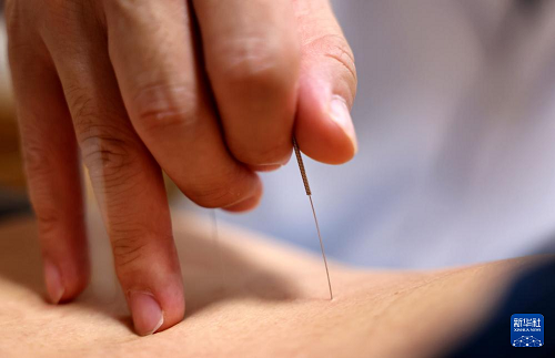 8月18日,山东省枣庄市妇幼保健院的医生为患者针灸。(新华社发 孙中喆 摄)