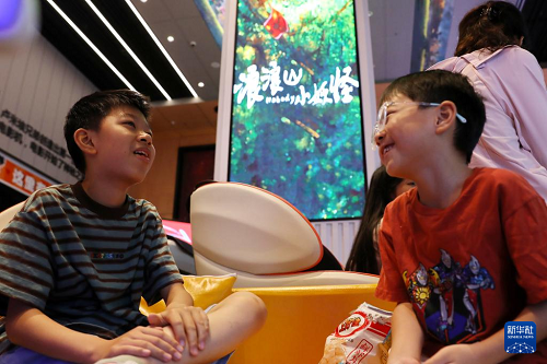 8月17日,小朋友在浙江省嘉兴市南湖区一家影城等候观影。(新华社发 金鹏 摄)
