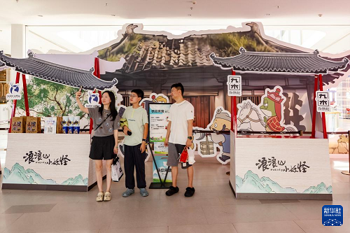 8月17日,观众在江苏省泰州市万象影城动画电影《浪浪山小妖怪》海报前拍照留念。(新华社发 汤德宏 摄)