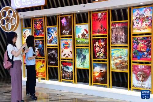 8月17日,观众在江苏省无锡市一家影城的电影海报前驻足。(新华社发 还月亮 摄)