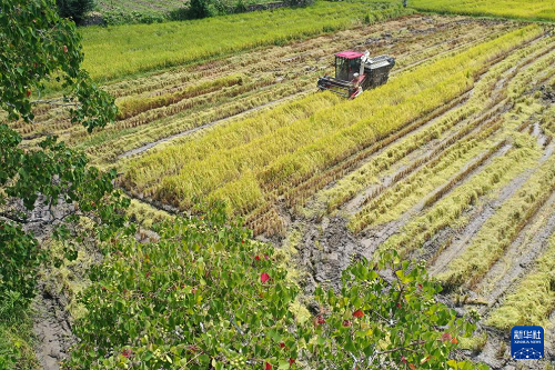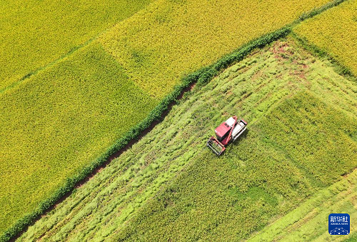 8月23日,农民驾驶收割机在湖南省湘西土家族苗族自治州龙山县石羔街道收割水稻(无人机照片)。(新华社发 曾祥辉 摄)