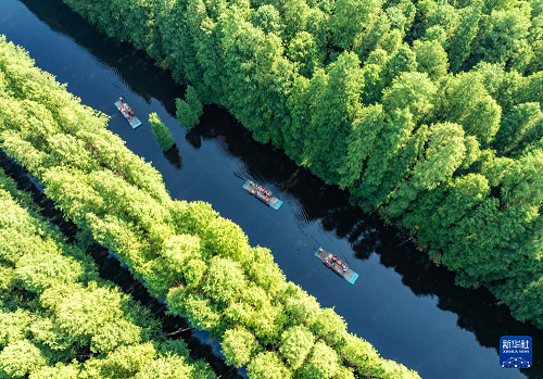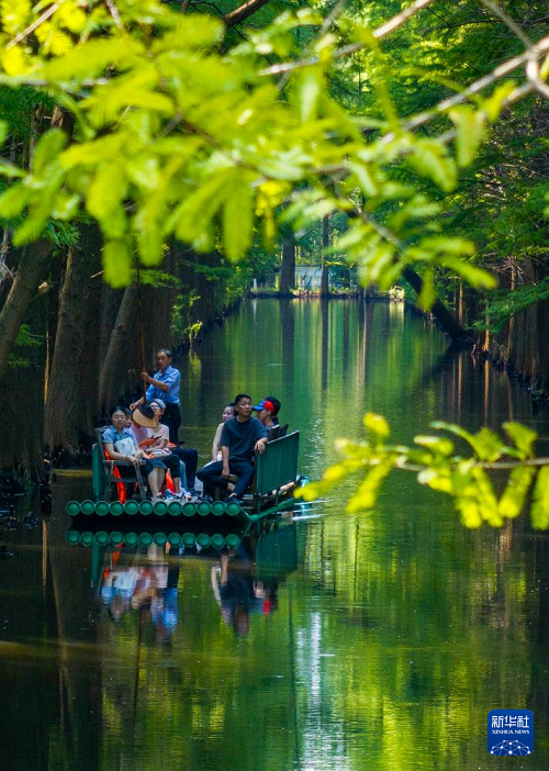8月30日,游人在江苏省淮安市金湖县水上森林景区乘坐竹筏游览美景(无人机照片)。(新华社发 周社根 摄)