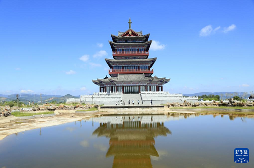 8月31日,游客在河南省洛阳市汝阳县瑞云山森林公园瑞云阁观光。(新华社发 康红军 摄)