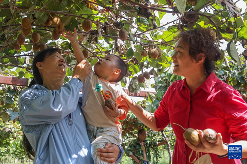 8月31日,游客在河南省平顶山市宝丰县闹店镇小张庄村一家猕猴桃种植园采摘。(新华社发 何五昌 摄)