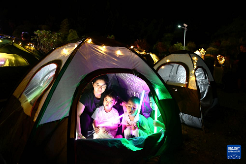 8月29日,在湖北省咸宁市通城县黄龙林场,游客搭起帐篷,享受露营的乐趣。(新华社发 刘建平 摄)