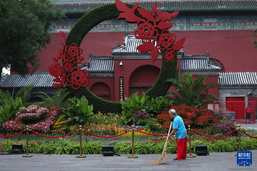9月3日清晨,市民在北京鼓楼附近清扫街道。(新华社记者 杜昕怡 摄)