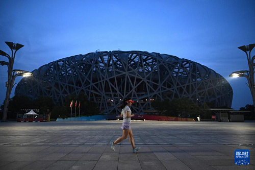 9月3日清晨,市民在鸟巢前晨跑。(新华社记者 陈浩明 摄)