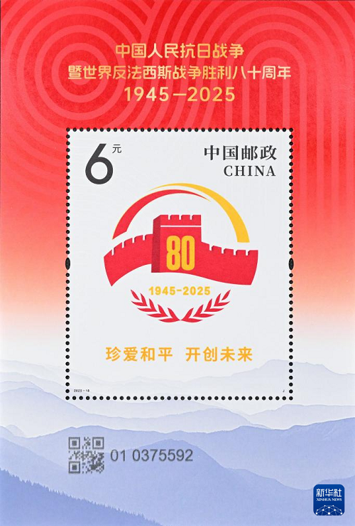 这是9月3日拍摄的《中国人民抗日战争暨世界反法西斯战争胜利八十周年》纪念邮票小型张。(新华社记者 李贺 摄)
