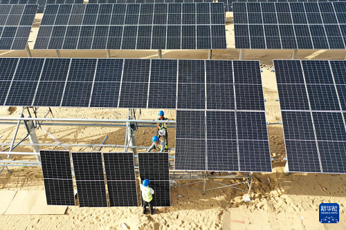 工人在库布其沙漠里的杭锦旗朔方新能源大基地安装光伏板(9月2日摄,无人机照片)。(新华社记者 李志鹏 摄)