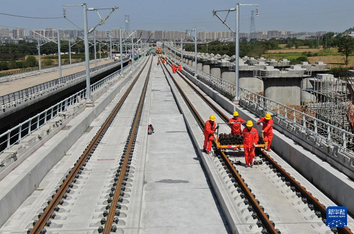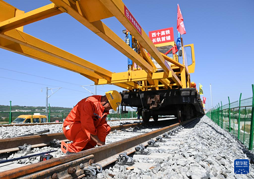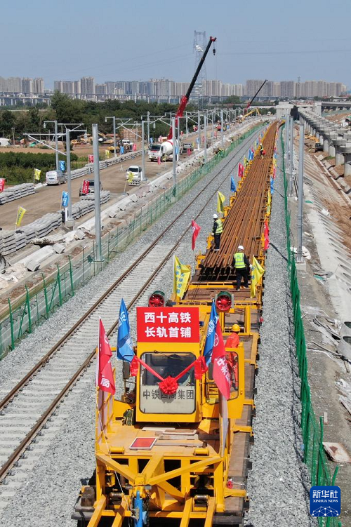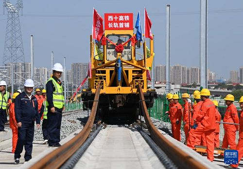 9月8日,施工人员在西十高铁西安东至蓝田区间铺设无缝钢轨。(新华社记者 李一博 摄)