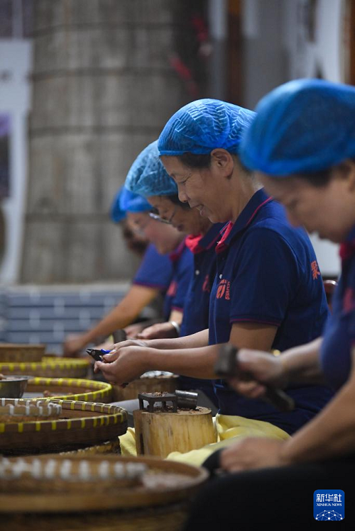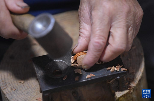 9月9日,在临安龙岗镇一家山核桃生产企业,工作人员通过手敲山核桃取整仁。(新华社记者 翁忻旸 摄)
