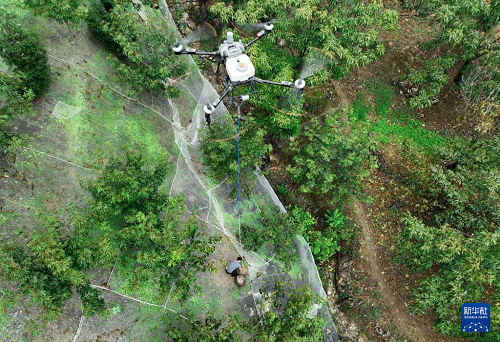 9月9日,在临安岛石镇的一片山核桃林上方,农用无人机将采收的山核桃运送出山(无人机照片)。(新华社记者 翁忻旸 摄)